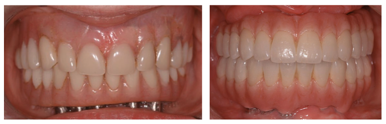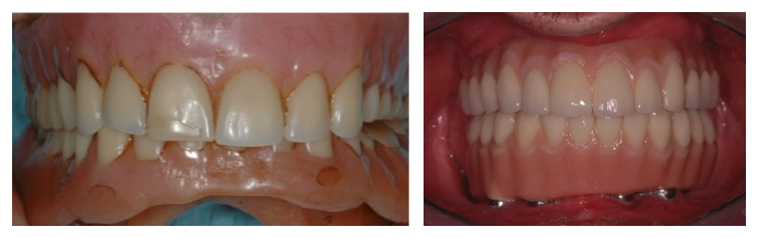 La patient s’est présenté à la première visite avec une prothèse totale amovible supérieure et une prothèse totale implantaire inférieure avec des dents temporaires en résine.