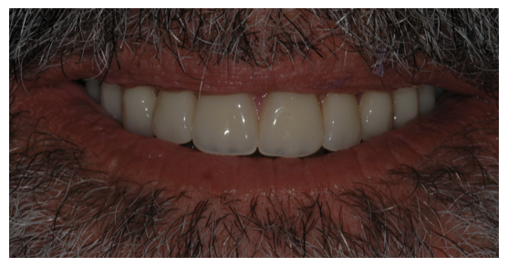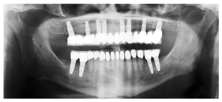 Le patient se présente au cabinet avec une mâchoire supérieure totalement édentée et des signes d’usure généralisés. Le traitement a consisté en une réhabilitation totale sur implants de l’arcade supérieure, des implants pour remplacer les molaires mandibulaires et des couronnes pour rétablir une occlusion stable et répondre aux exigences esthétiques du patient.